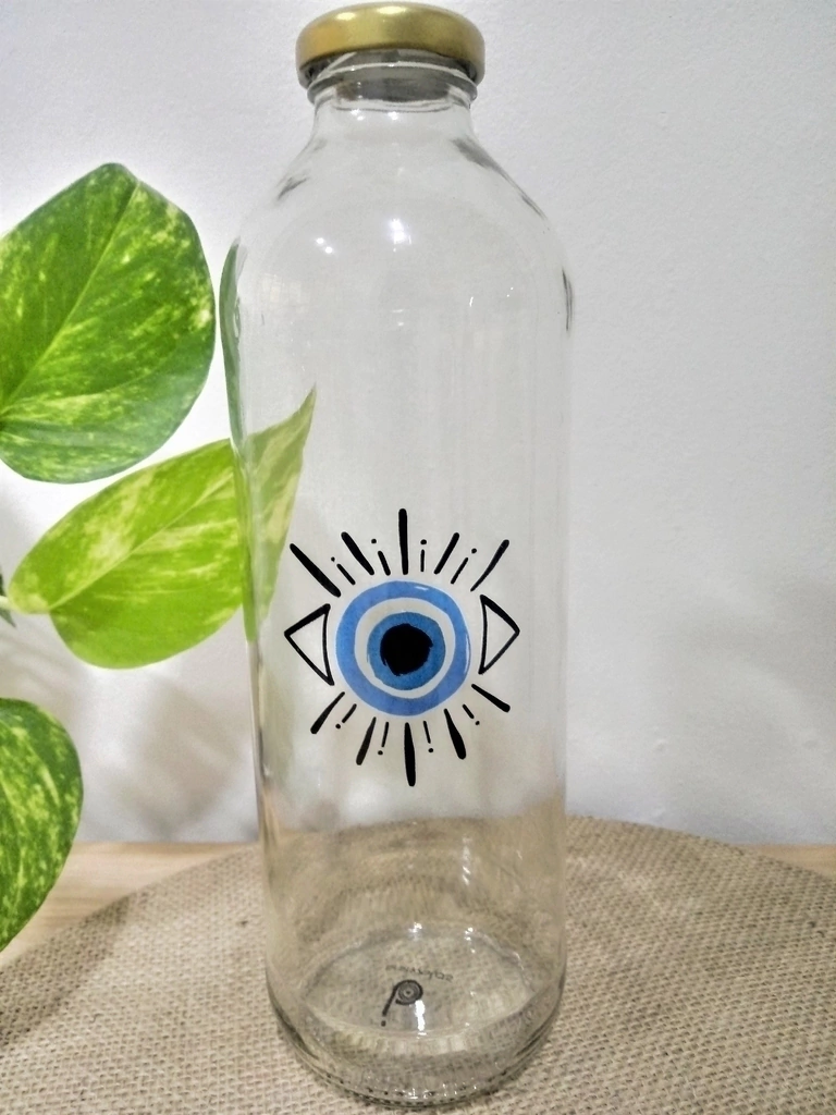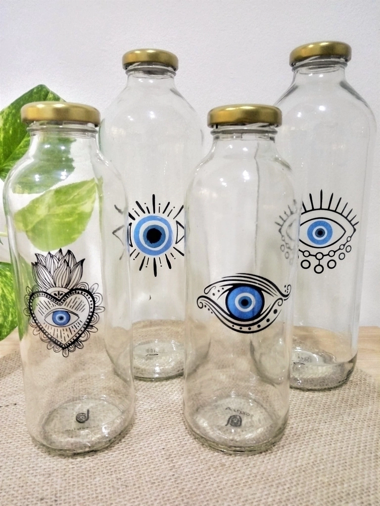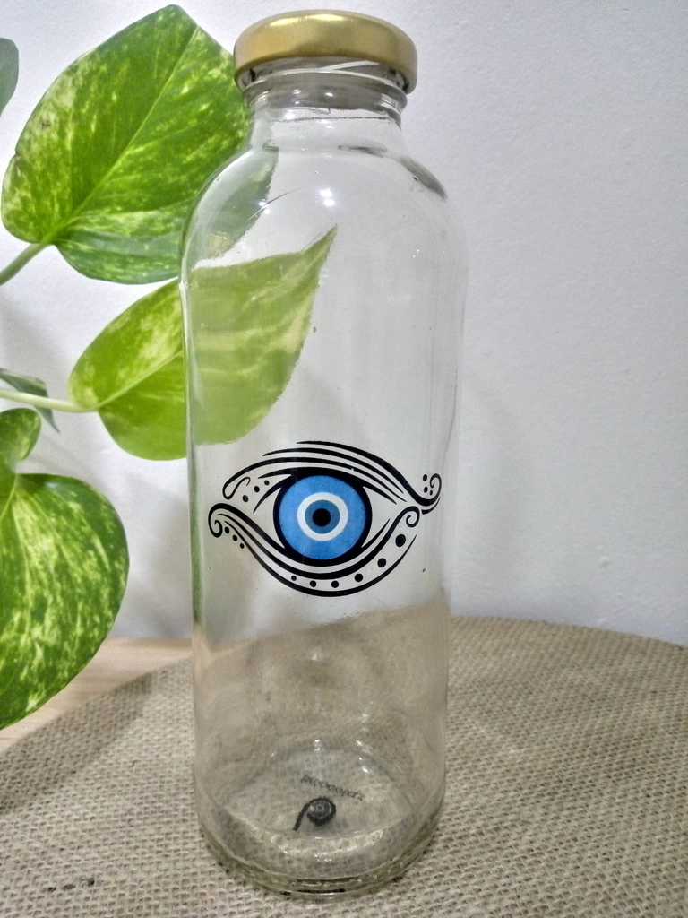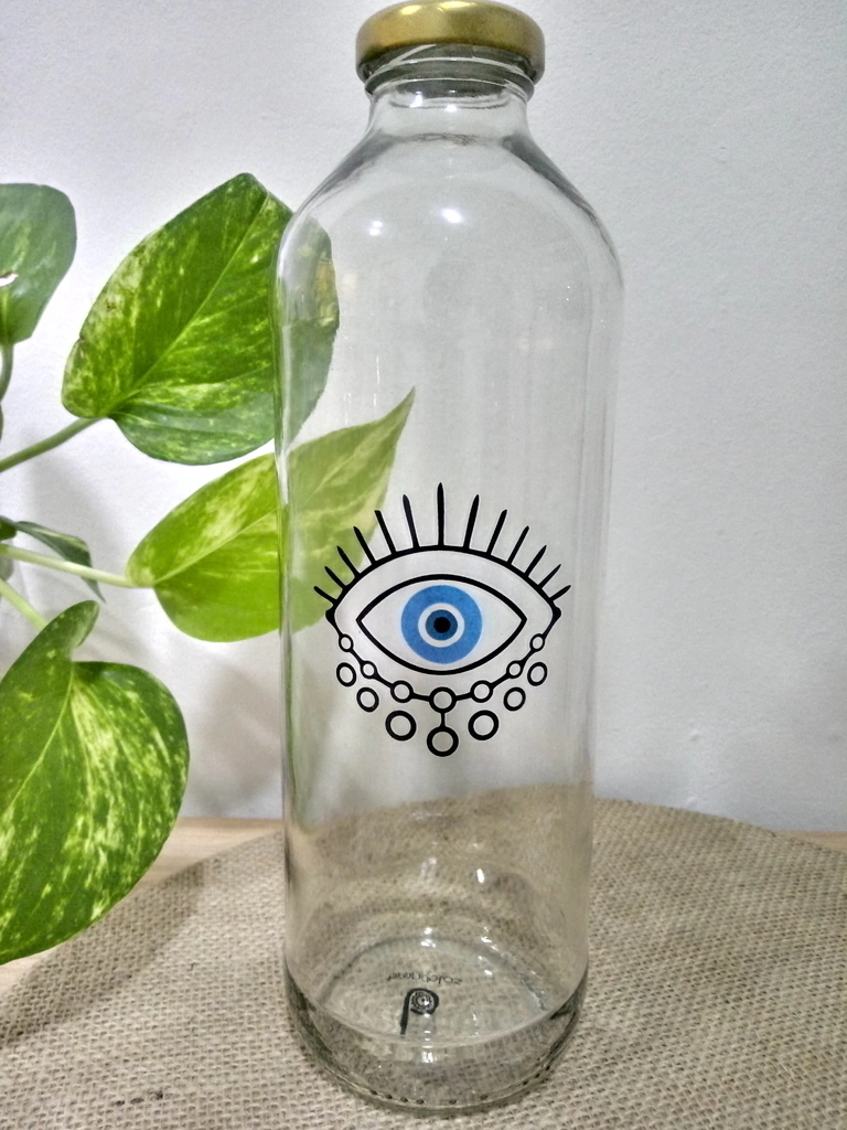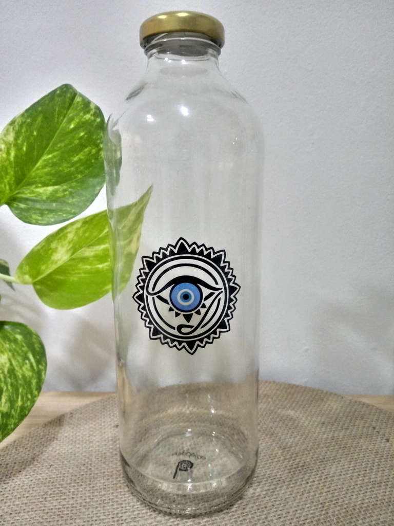 Botella de vidrio estampadas con tapa metálica a rosca.